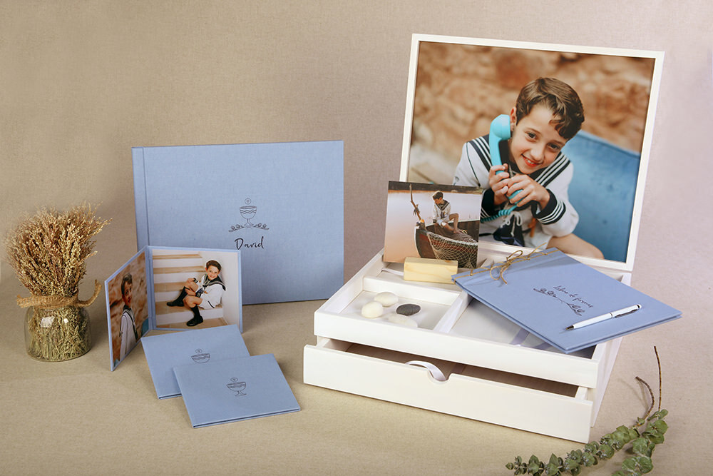 Compuesto por una caja Lux de madera blanca con fotografía interior, álbum de 28x35, Libro de firmas japonés de 20x25, 3 dípticos de tapa dura 15x15, Photoblock de 16x14 con peana de madera y bolígrafo básico de tinta azul
